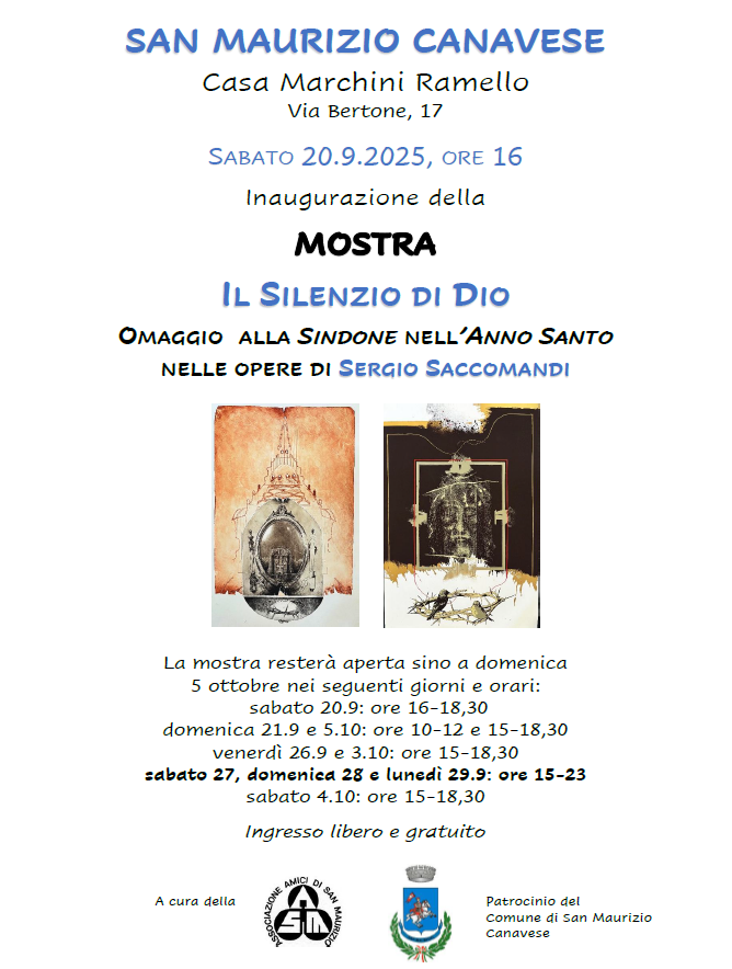 Eventi ed Attività: MOSTRA FESTA PATRONALE 2025 fino al 5 ottobre Il Silenzio di Dio Omaggio alla Sindone nell’Anno Santo nelle opere di Sergio Saccomandi